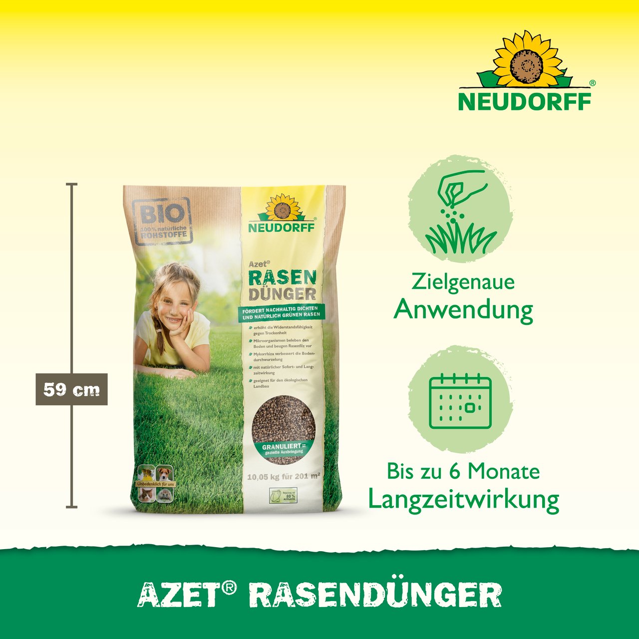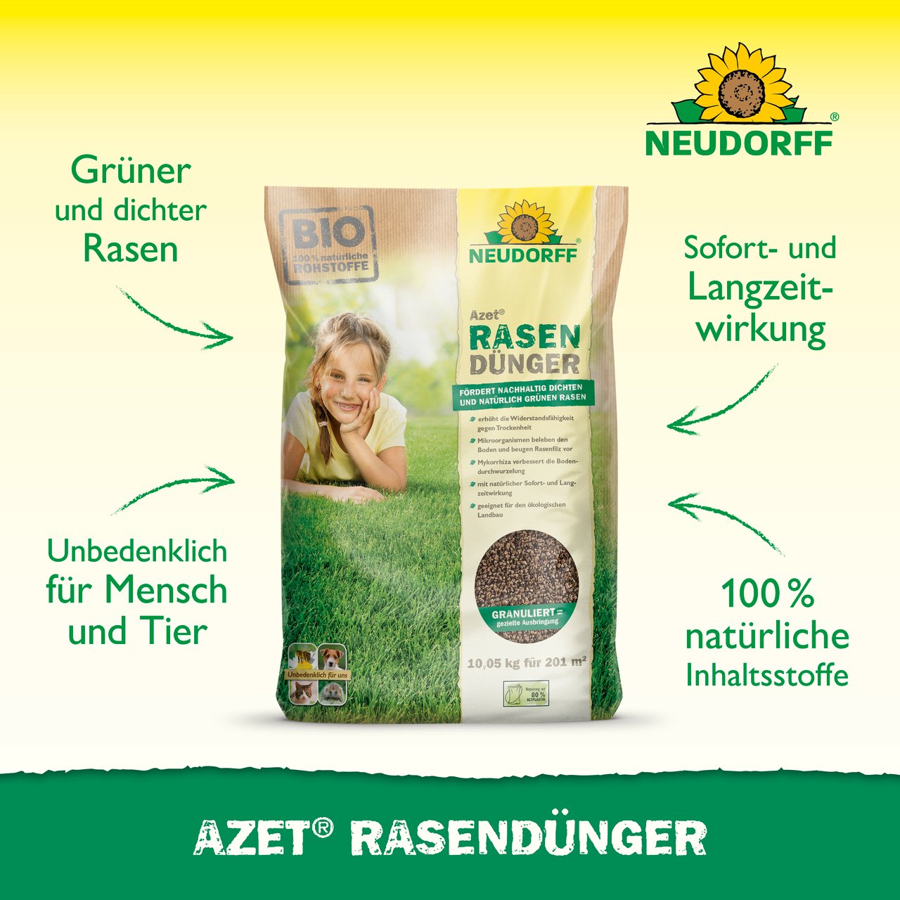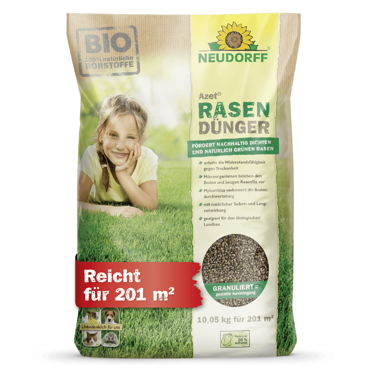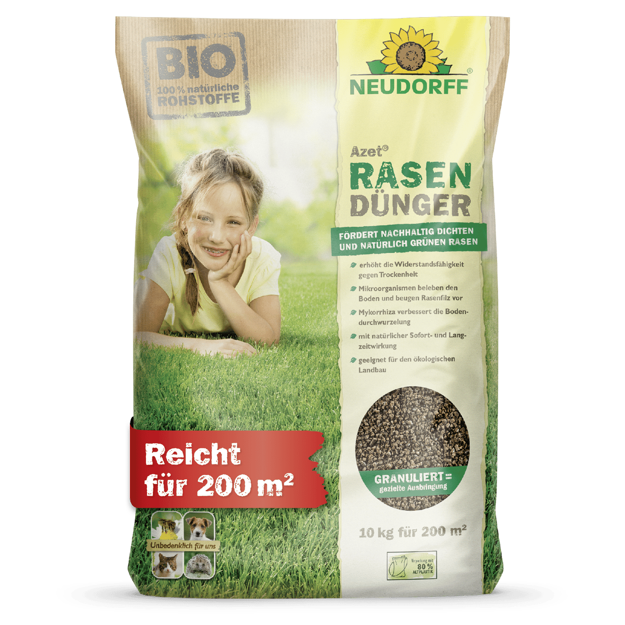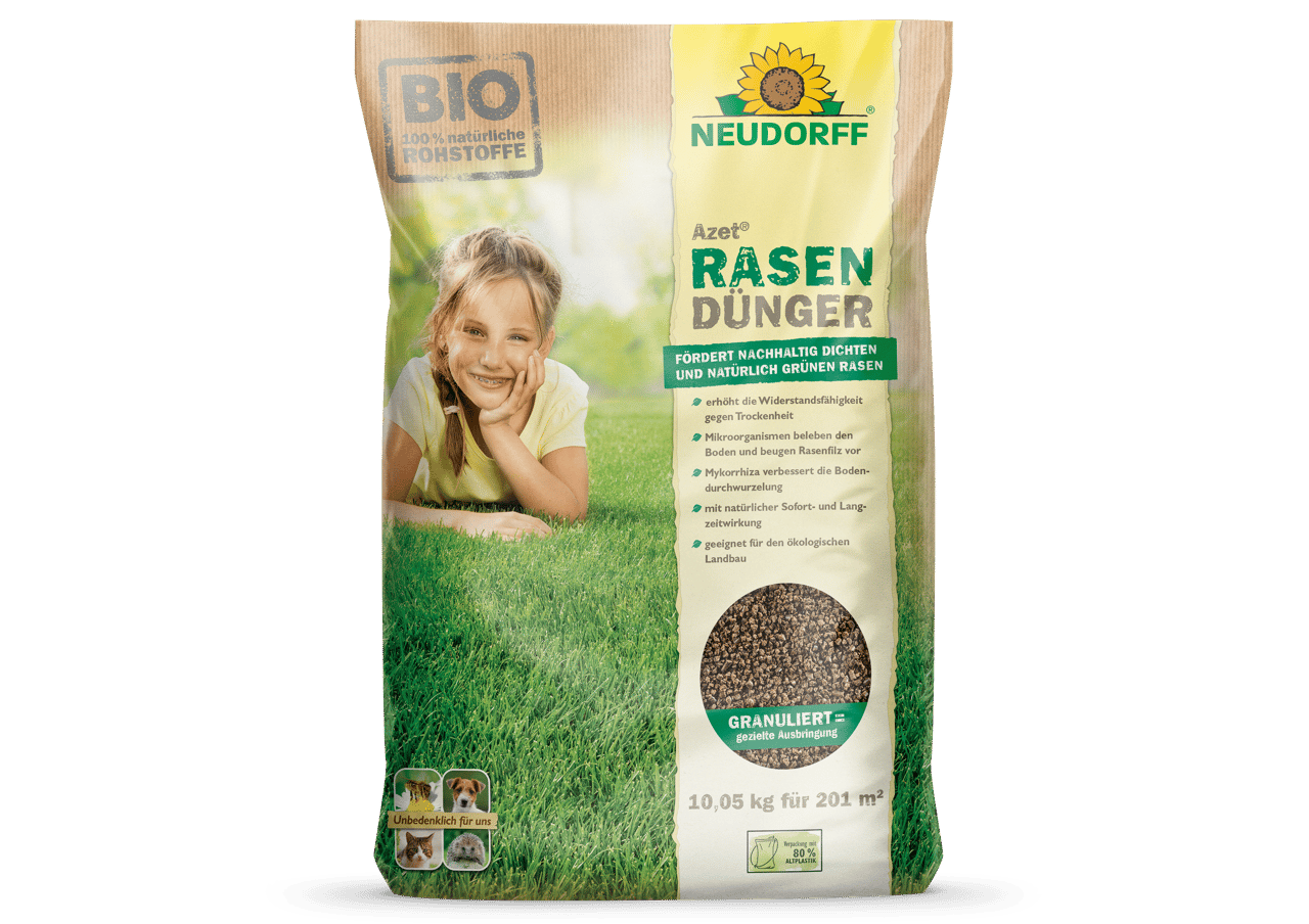 Azet RasenDünger ist ein organischer NPK-Dünger 8-3-4. Der Dünger enthält natürliche Mykorrhiza-Pilze und verschiedene Bodenbakterien. Mykorrhiza-Pilze verbinden sich mit Pflanzenwurzeln und vergrößern deren Oberfläche um ein Vielfaches. Dadurch wird eine höhere Wasser- und Nährstoffaufnahme aus den tieferen Bodenschichten sichergestellt. So hilft Mykorrhiza bei Trockenheit und ernährt die Pflanze zusätzlich.