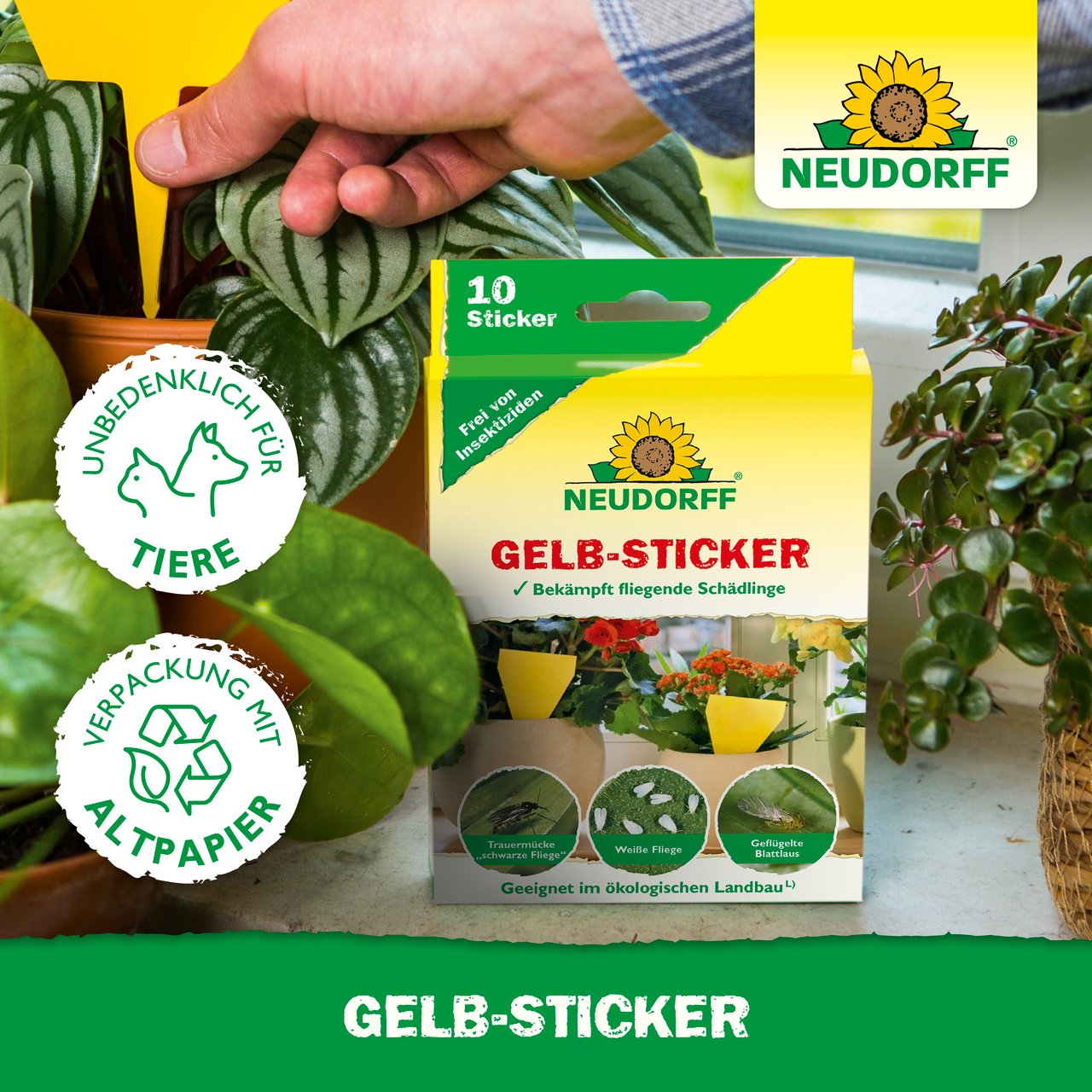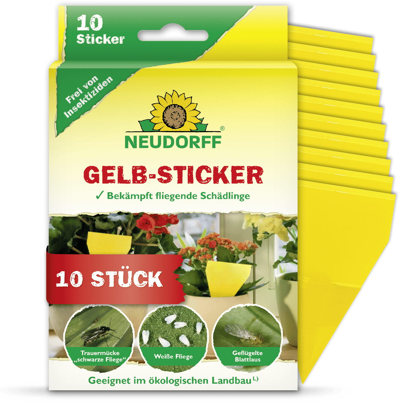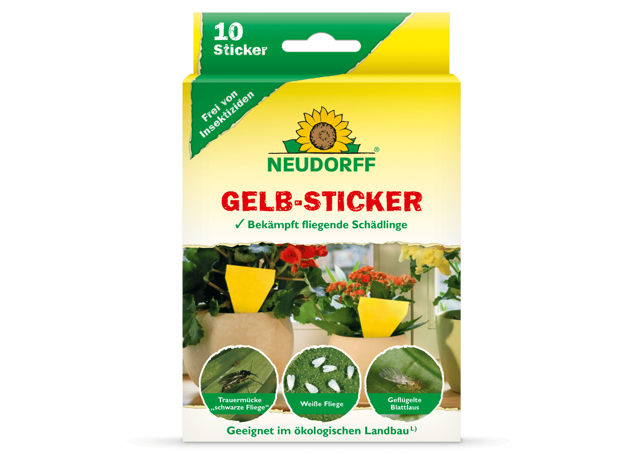 Mit Gelb-Stickern bekämpfen Sie völlig insektizidfrei fliegende Schädlinge an Pflanzen auf Blumenbänken, in Wintergärten und im Gewächshaus. Die Gelb-Sticker sind mit einem geruchlosen Spezialleim beschichtet, der weder austrocknet noch bei höheren Temperaturen abtropft. Der gelbe Farbton ist speziell auf Pflanzenschädlinge wie Trauermücken („schwarze Fliegen“), Weiße Fliegen, geflügelte Blattläuse, Thripse, Minierfliegen sowie Zikaden abgestimmt und lockt diese an. Kommen die Pflanzenschädlinge in Kontakt mit der Klebefläche, bleiben die Schädlinge sicher haften. Stecken Sie die Gelb-Sticker einfach direkt in die Pflanzerde. Die Klebefähigkeit des insektizidfreien Spezialleims wird selbst durch Wasser nicht beeinträchtigt.