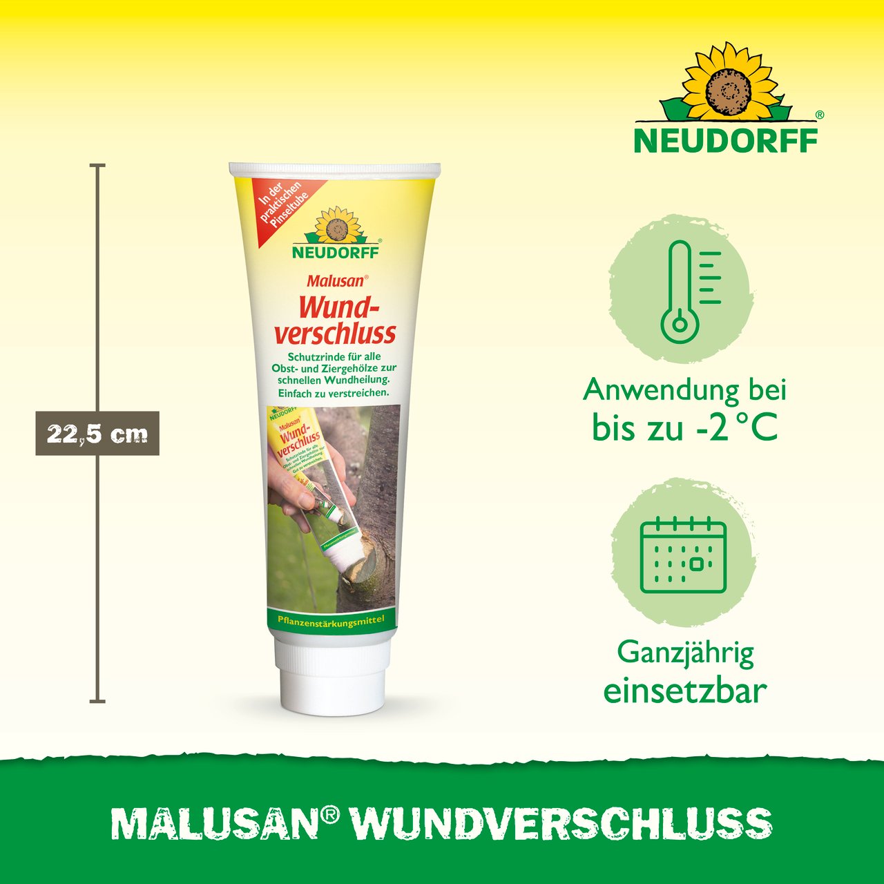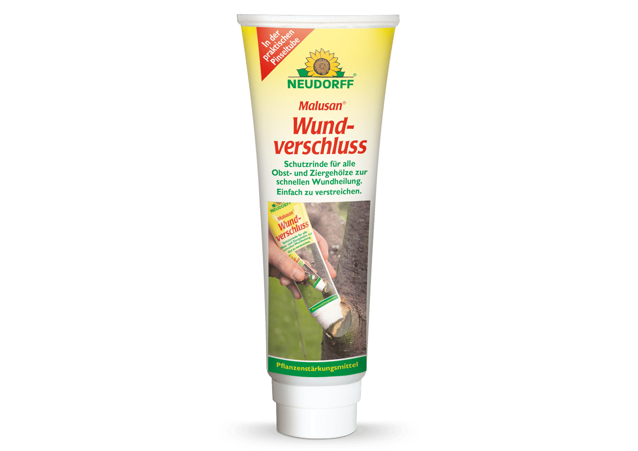 Malusan Wundverschluss ist ein gebrauchsfertiges Wundverschlussmittel zum Einsatz an allen Obst-und Ziergehölzen. Der angetrocknete Belag bildet eine Schutzrinde, welche die schnelle Wundheilung fördert und zur Gesunderhaltung der Gehölze beiträgt. Diese mechanische Barriere verhindert das Eindringen von holzzerstörenden Organismen. Malusan Wundverschluss tropft nicht und bildet nach dem Antrocknen einen gleichmäßigen, haltbaren und unauffälligen Belag von hoher Elastizität. Malusan Wundverschluss kann auch bei leichtem Frost (bis -2 °C) verstrichen werden.