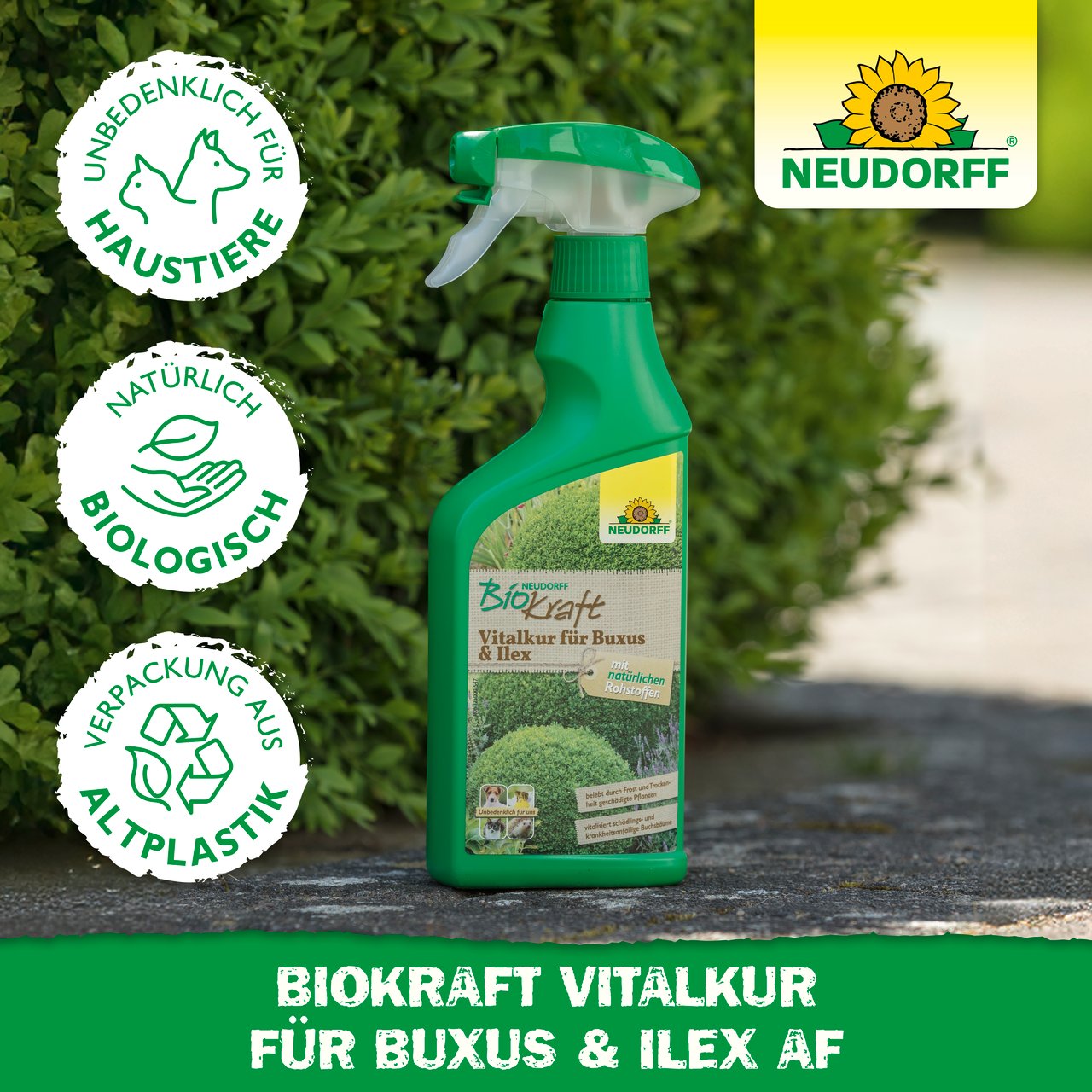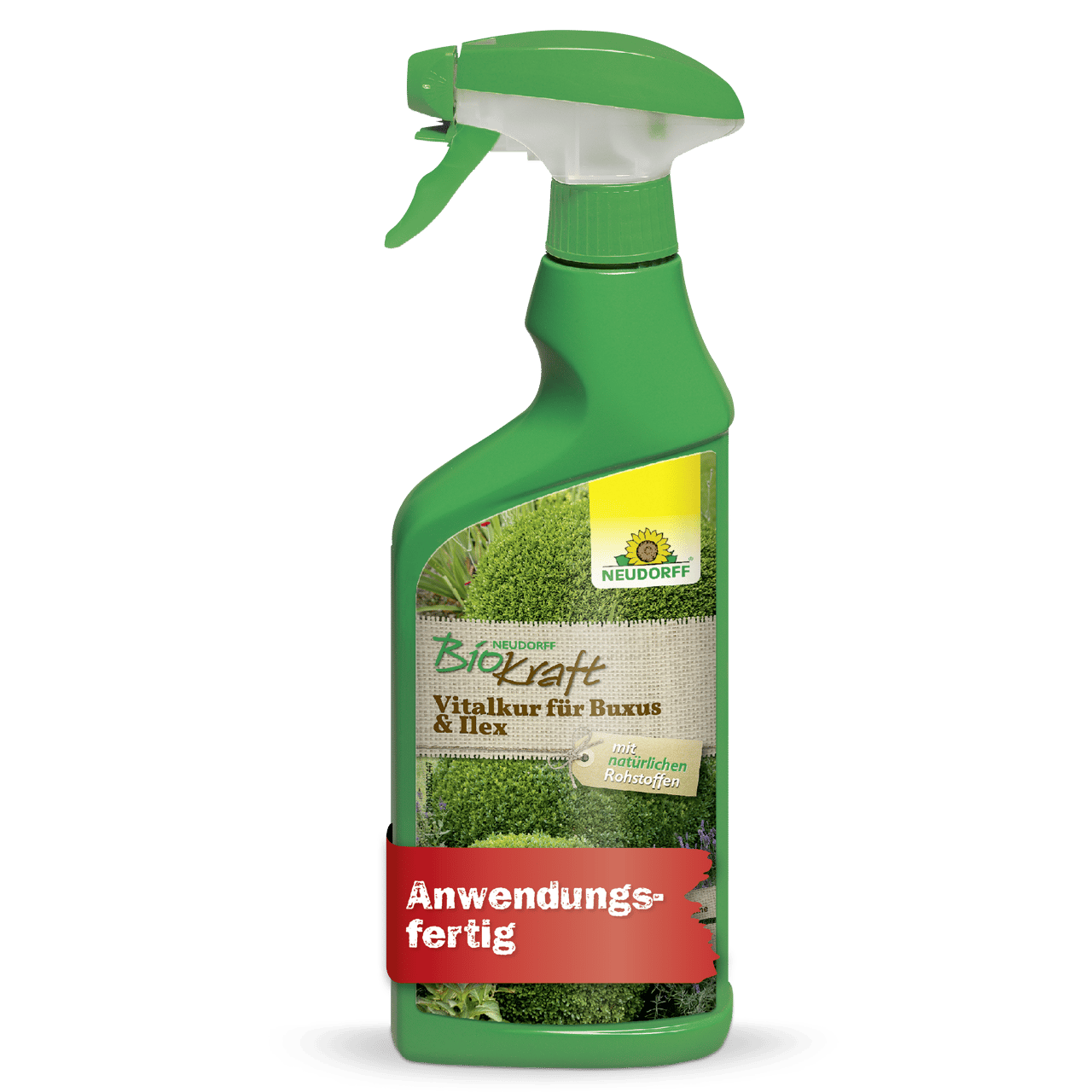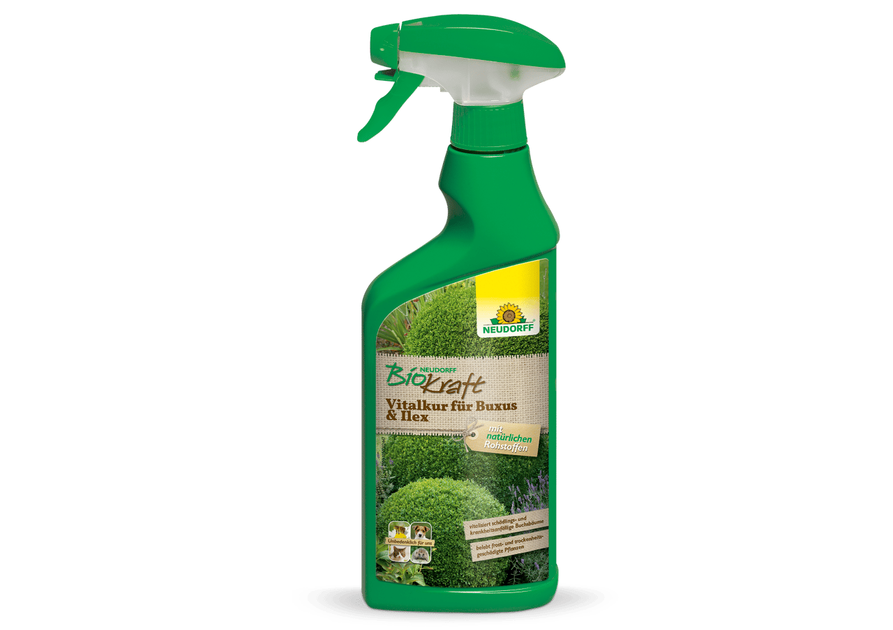 Die anwendungsfertige Neudorff BioKraft Vitalkur für Buxus & Ilex aus spurenelementreichen Pflanzenextrakten vitalisiert schädlings- und krankheitsanfällige Buchsbäume. Direkt auf die Blätter gespritzt, wird das Mittel von der Pflanzen schnell und direkt aufgenommen.
