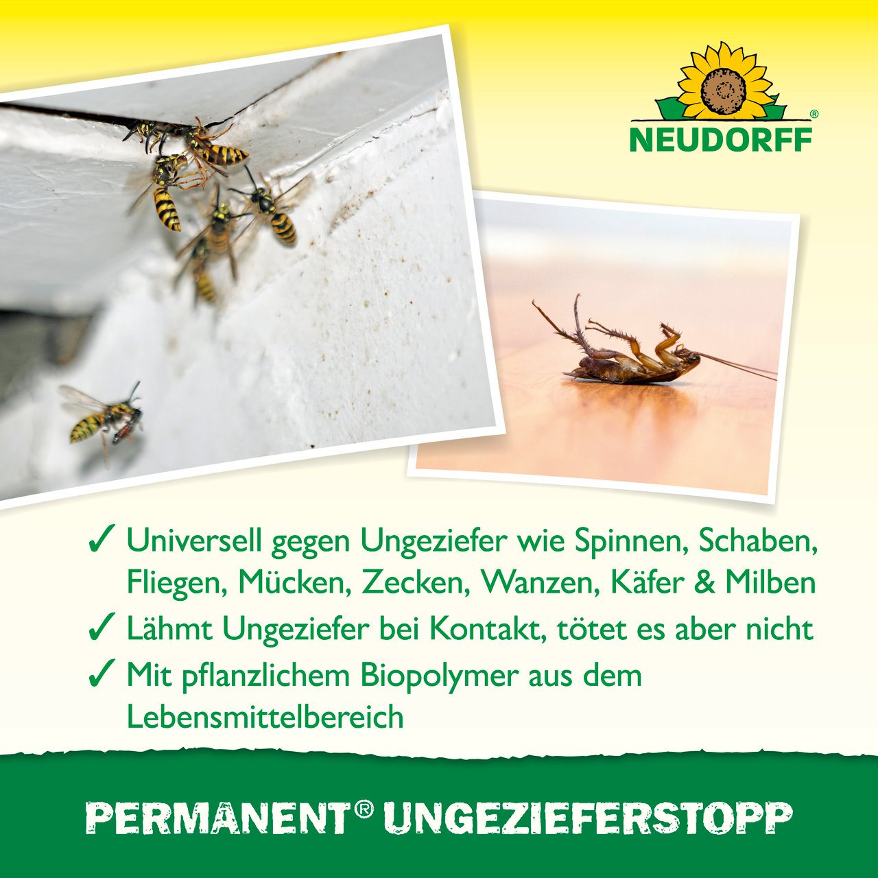 Permanent UngezieferStopp, eine innovative Lösung im Kampf gegen Ungeziefer im Haushalt. Es enthält keine Insektizide und wirkt stattdessen durch einen physikalischen Mechanismus, der Ungeziefer zuverlässig lähmt, indem es dieses benetzt.