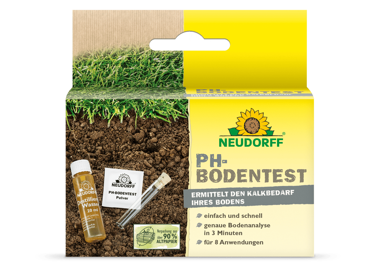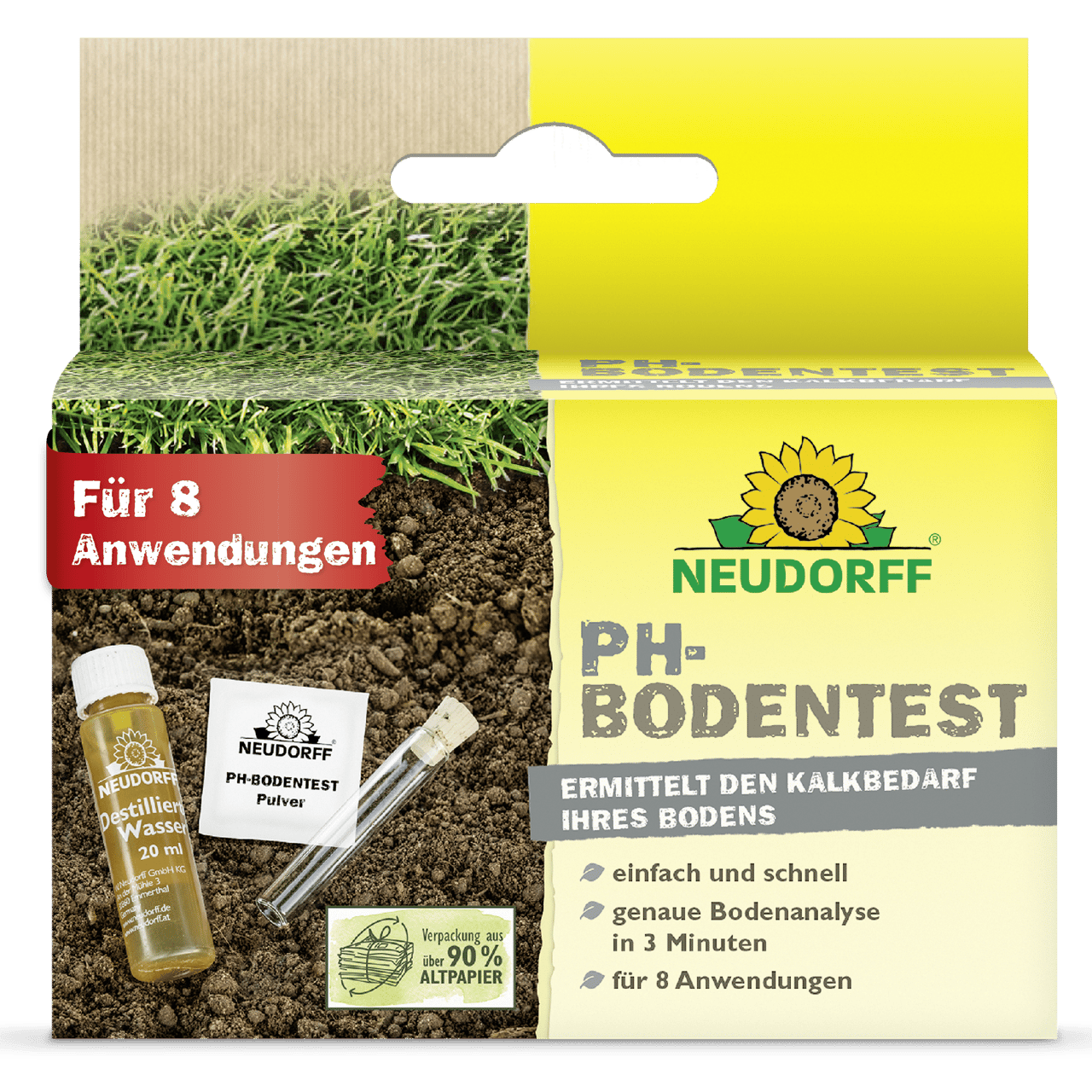 Das ph-Bodentest-Set besteht aus einem Tütchen ph-Bodentest-Pulver, einem Fläschchen destilliertem Wasser und einem Untersuchungsröhrchen. Auf dem beiliegenden Merkblatt sind alle Schritte zur Ermittlung des Boden-pH-Wertes genau erklärt.