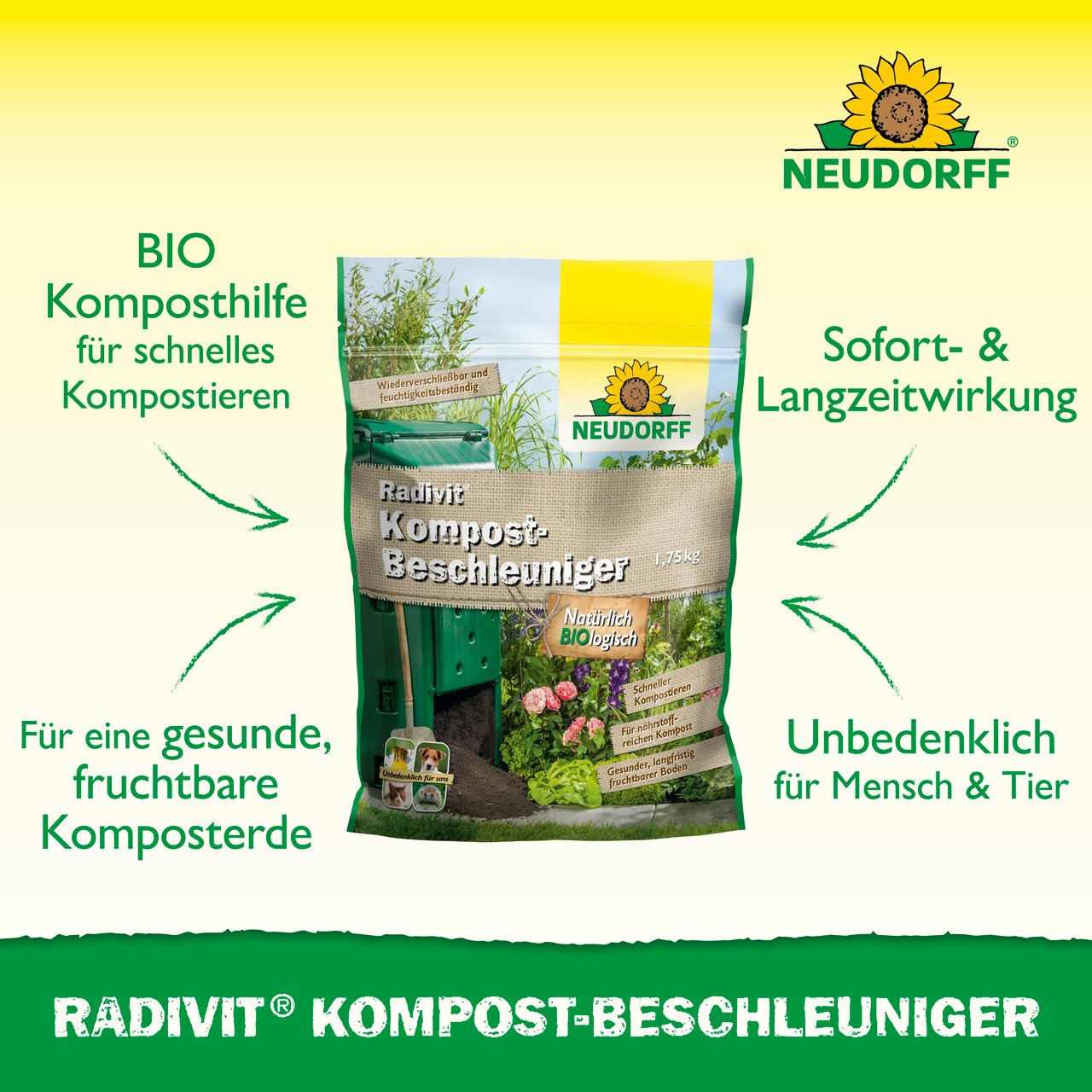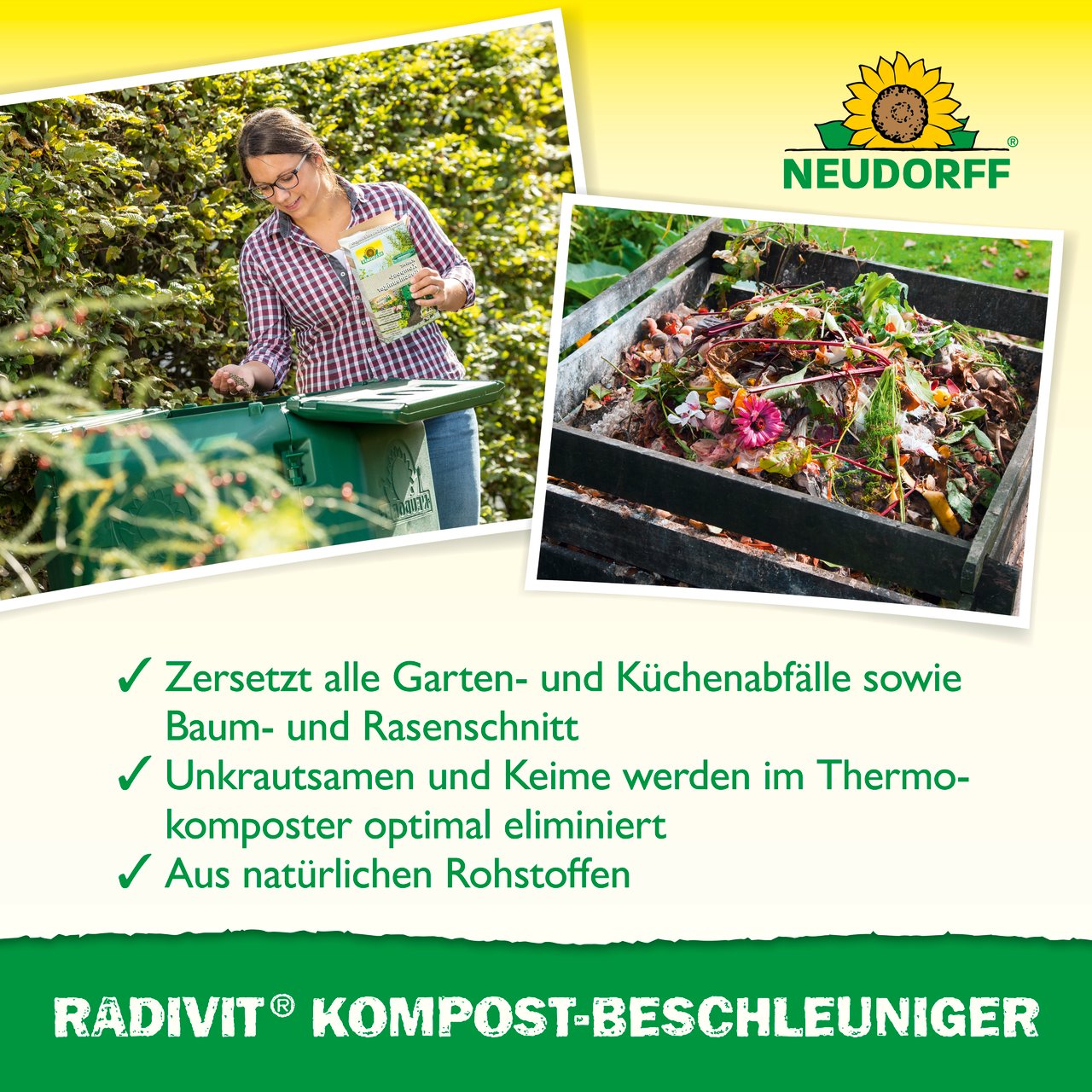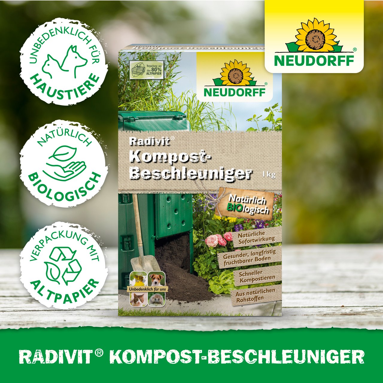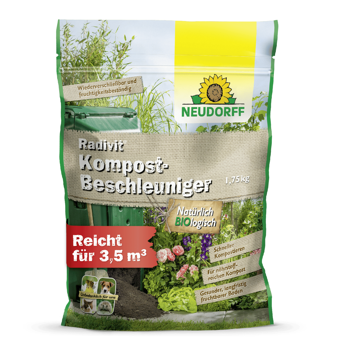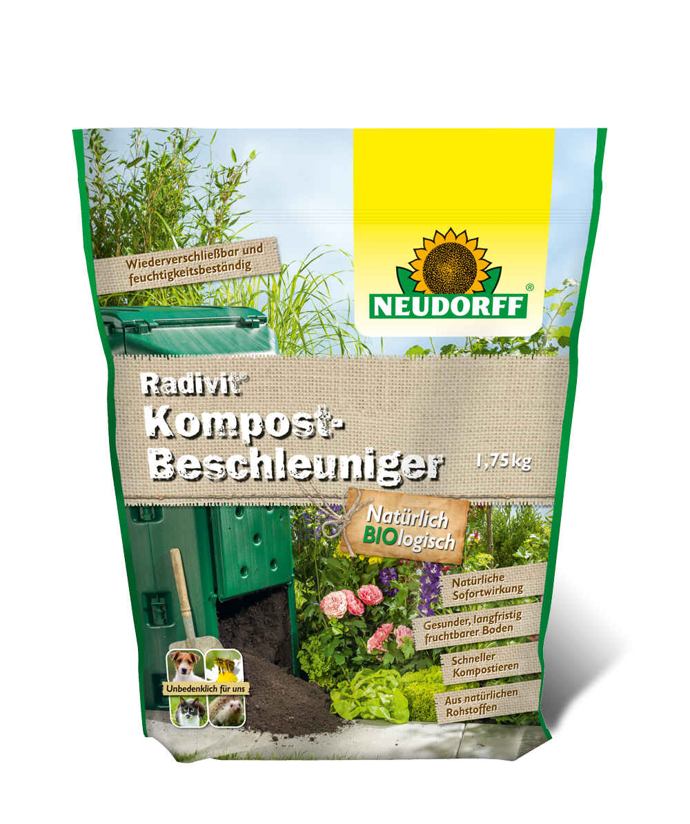 Radivit KompostBeschleuniger ist eine biologische Komposthilfe für wertvollen Humus. Der Zersetzungsvorgang startet sofort nach der Anwendung. Radivit ist für alle organischen Rohmaterialien geeignet. Radivit KompostBeschleuniger ist so zusammengesetzt, dass er zum natürlichen Kreislauf im Garten passt und ihn unterstützt. Das Granulat führt der frischen Kompostmasse natürliche Mikroorganismen zu und liefert Nährstoffe, die zu einer schnellen Etablierung und Vermehrung der zersetzenden Mikroorganismen beitragen. Bei Verwendung im Thermokomposter kommt es zu einer ersten hitzigen Phase, bei der viele Unkrautsamen und unerwünschte Keime absterben. Das Granulat kann natürlich auch in offenen Kompostmieten verwendet werden.